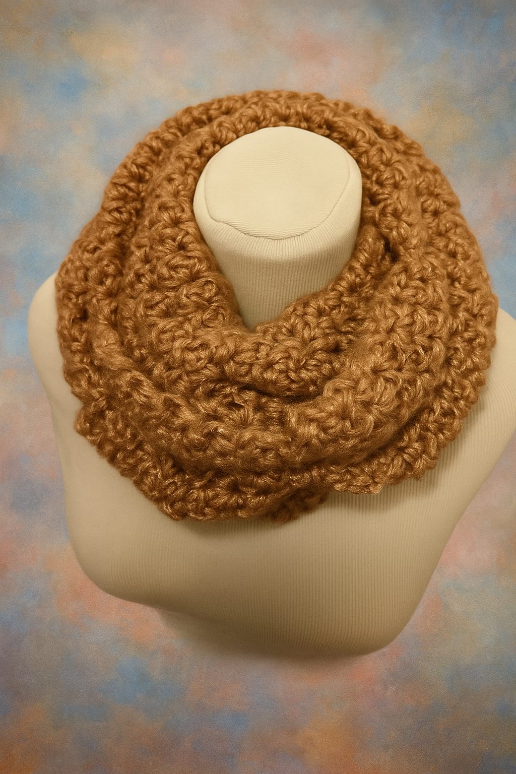 Tour de cou très chaud confectionné avec un lainage très doux et brillant 10%mérino 70%Polyamide 20%acrylic lavage à 30° avec une lessive spéciale laine. Ne passe pas au sèche linge. Couleur Camel métallisé 60 cm de longueur et 35 cm de largeur.